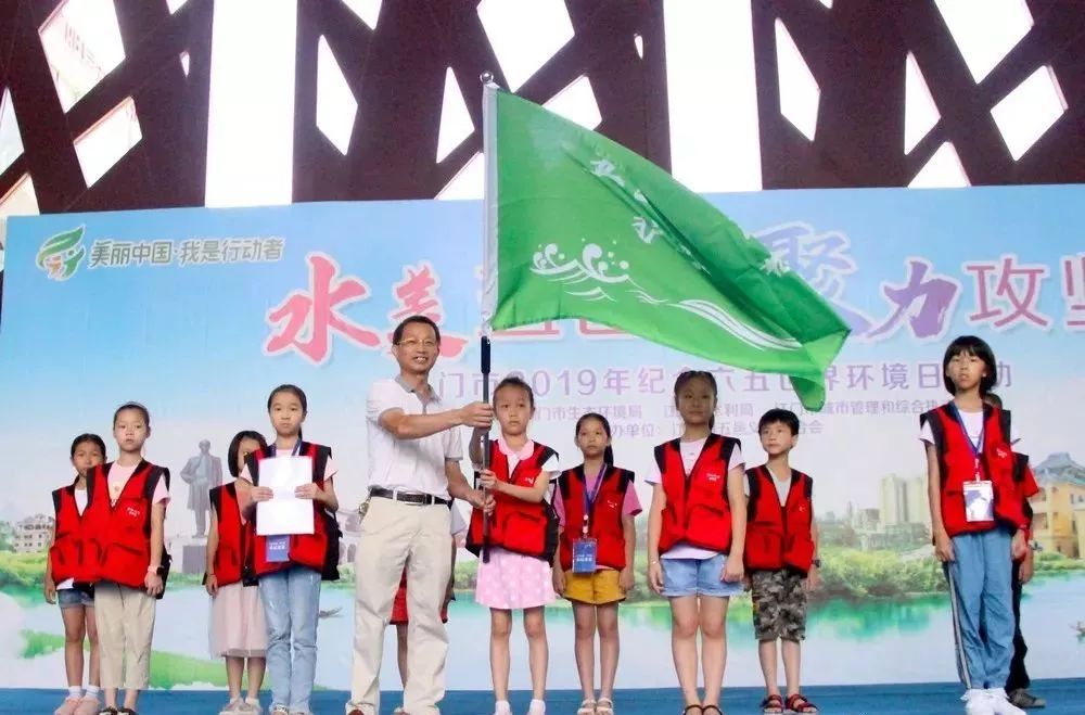 ▲市水利局副局长区舵样为五邑小记者“护河队”授旗
