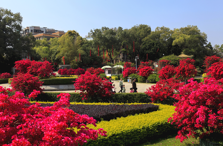 一是结合公园城市、美丽圩镇建设,在城市公园、广场、道路以及天桥、河岸等区域,种植了水红、绿樱、小叶紫等品种的簕杜鹃39万株,打造了许多市花绽放的美景。