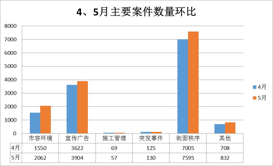 通过对4月、5月主要案件进行对比,发现城市管理领域的各类问题都呈上升趋势,特别是市容环境、街面秩序类问题较为突出,建议各县(市、区)城管部门加强巡查,及时对暴露垃圾、违规小广告、绿地脏乱等影响市容市貌现象及时处理,对占用市政道路、桥梁、人行天桥、地下通道、市场周边等公共场所进行摆摊、售卖家禽等违法行为进行执法取缔。