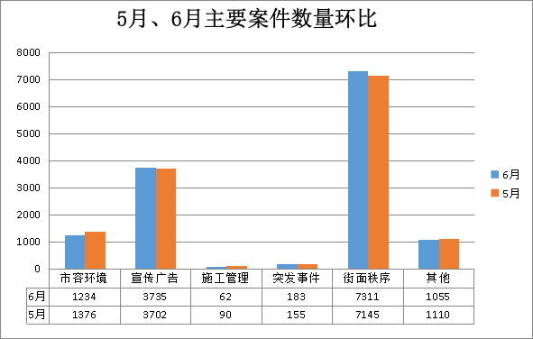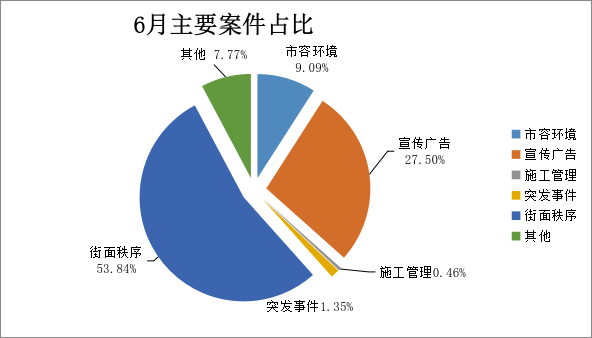 案件类别 | 6月(宗) | 5月(宗) | 增/减(宗) | 结案数(宗) | 结案率(%) | 案件主要类型 |