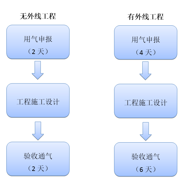 (一)无外线工程:用户提交资料,服务窗口受理。用气接入时间不超过4个工作日;