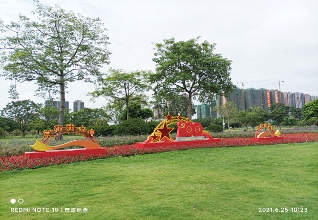 按照“热烈、节约”原则,在万达广场、东湖广场、江门枢纽站等城市重要公共空间设置庆祝中国共产党成立100周年主题花坛景观75组(其中15组配装光影设施),布置主题园艺景观200余处,种植和摆设长春花、百日草、红穗冠等鲜艳多彩的花卉绿植126.6万盆,形成万紫千红、华丽缤纷、欣欣向荣的景象。目前,花卉景观布置工作已全部完成。