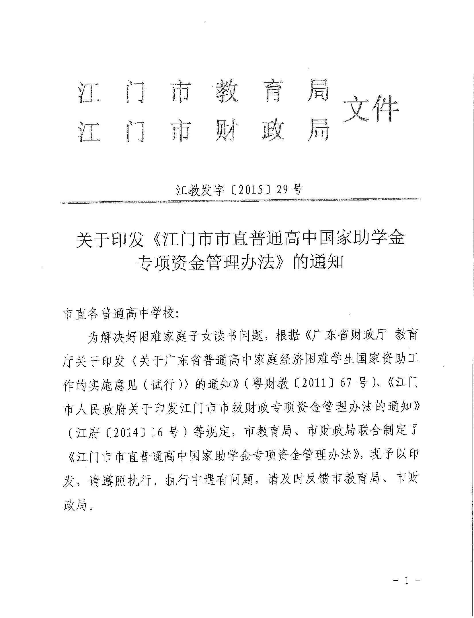 关于印发《江门市市直普通高中国家助学金专项资金管理办法》的通知_政策文件_江门市财政局