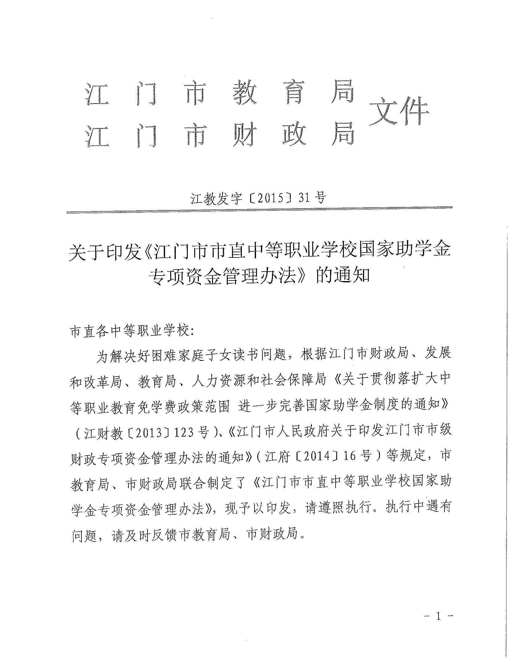 关于印发《江门市市直中等职业学校国家助学金专项资金管理办法》的通知_政策文件_江门市财政局