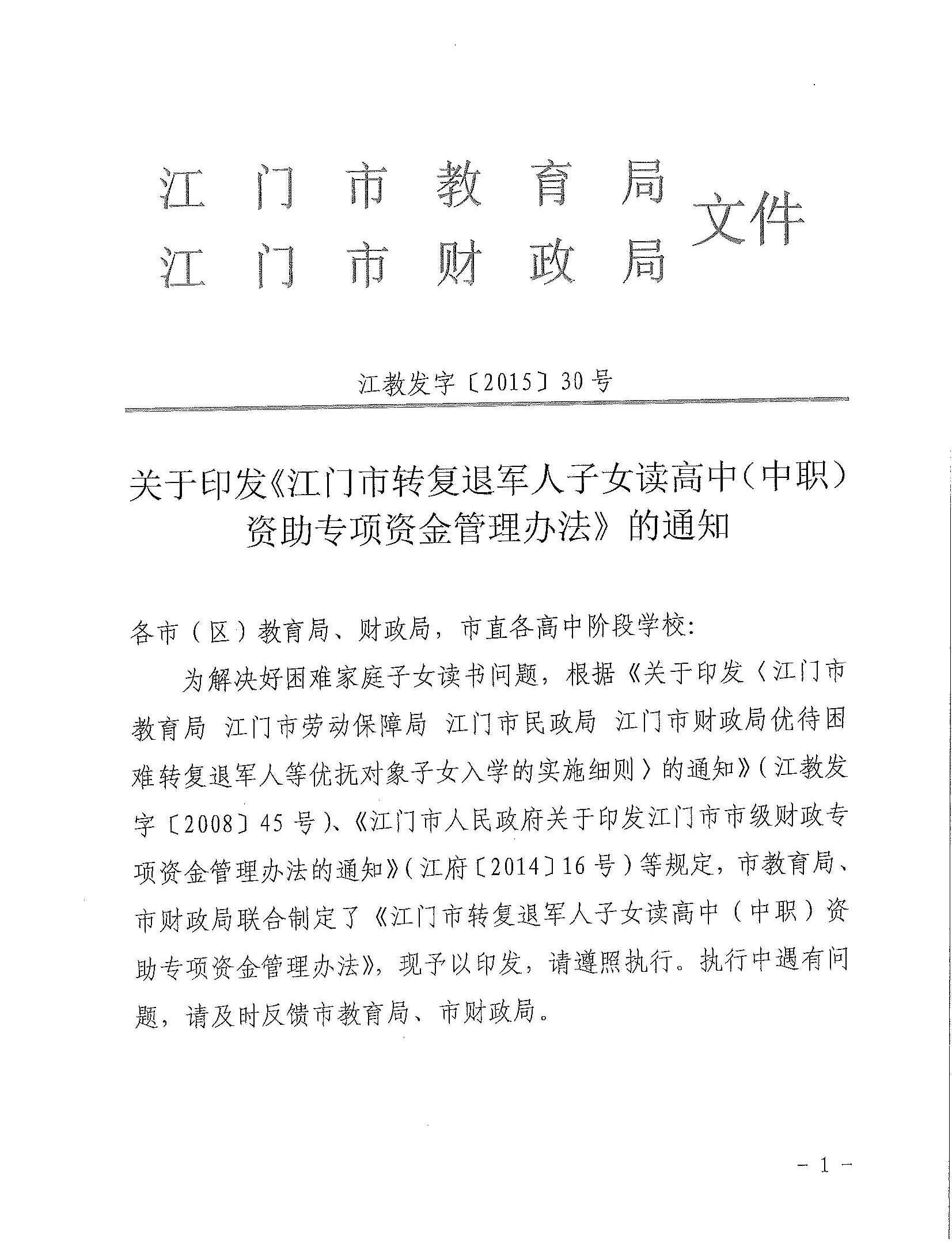 关于印发《江门市转复退军人子女读高中(中职)资助专项资金管理办法》的通知_政策文件_江门市财政局