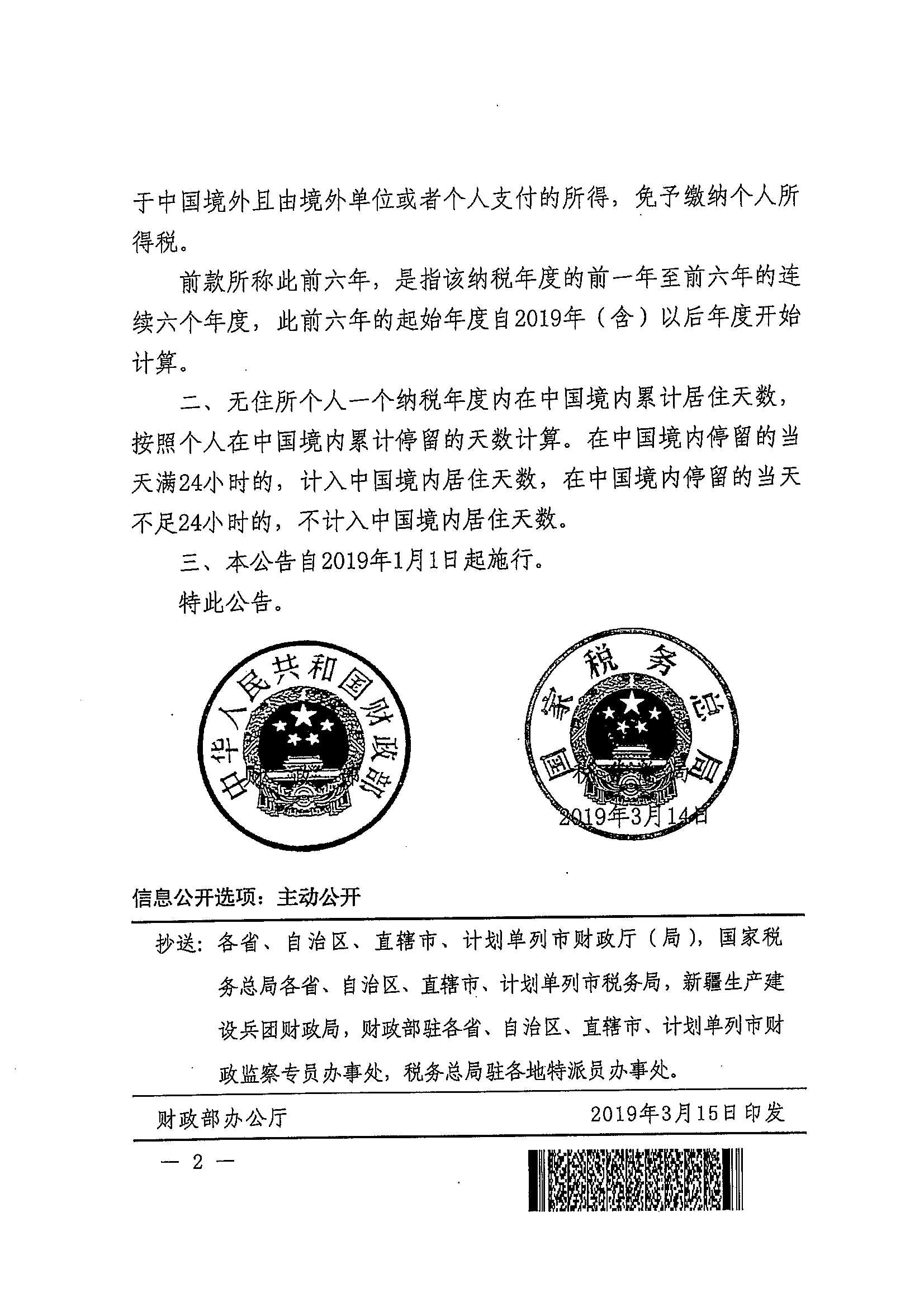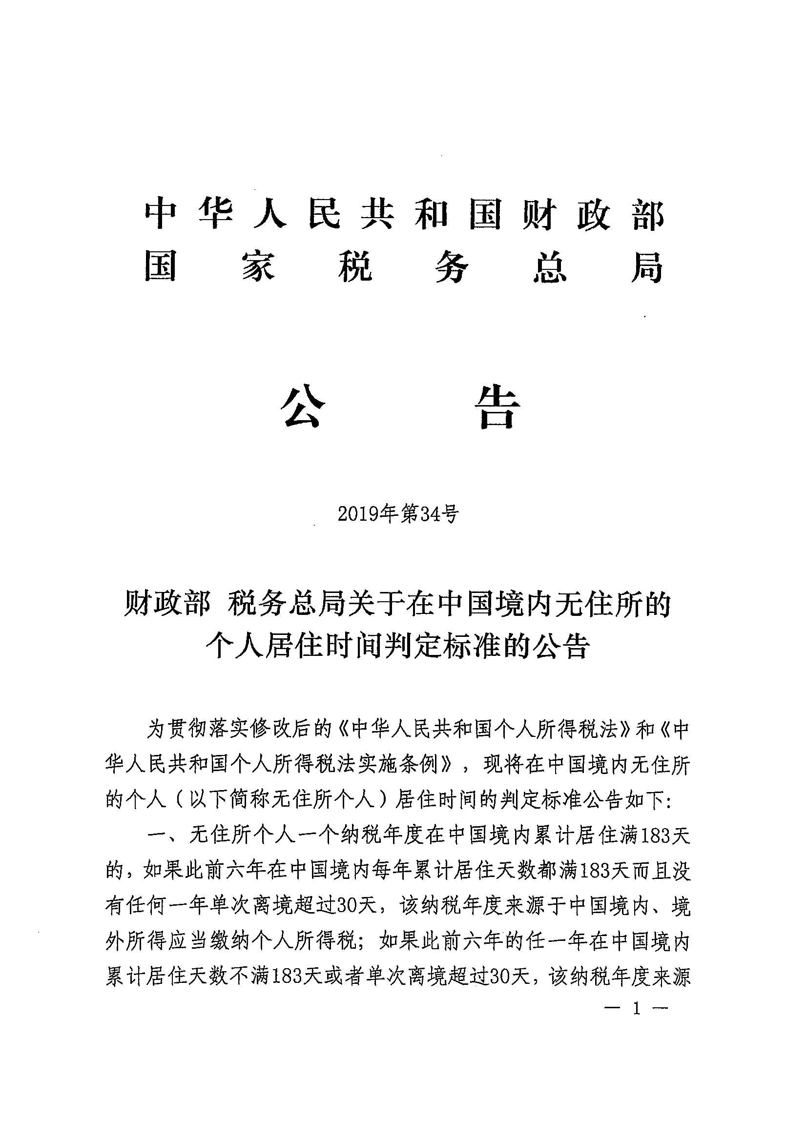 财政部 税务总局关于在中国境内无住所的个人居住时间判定标准的公告_政策文件_江门市财政局
