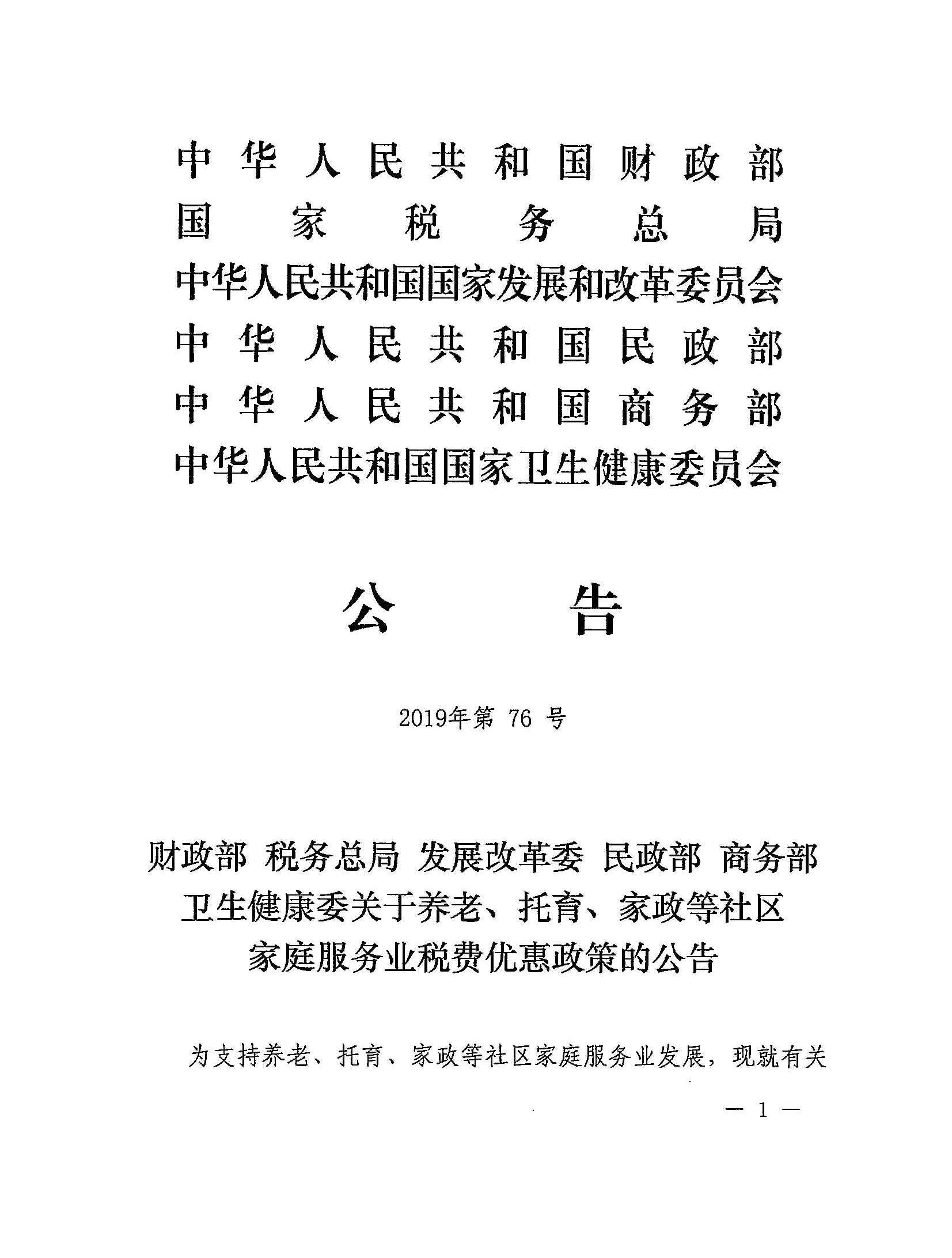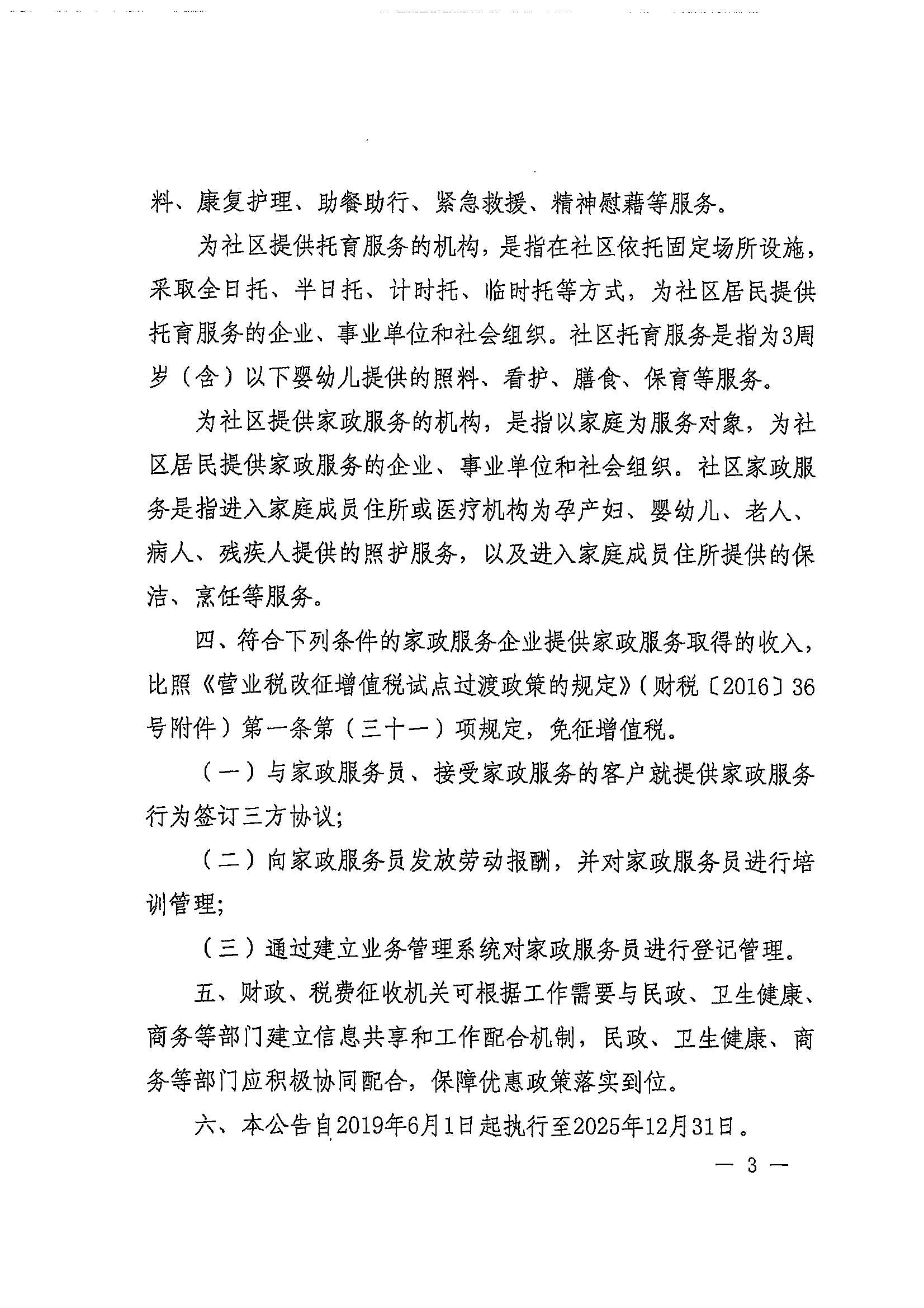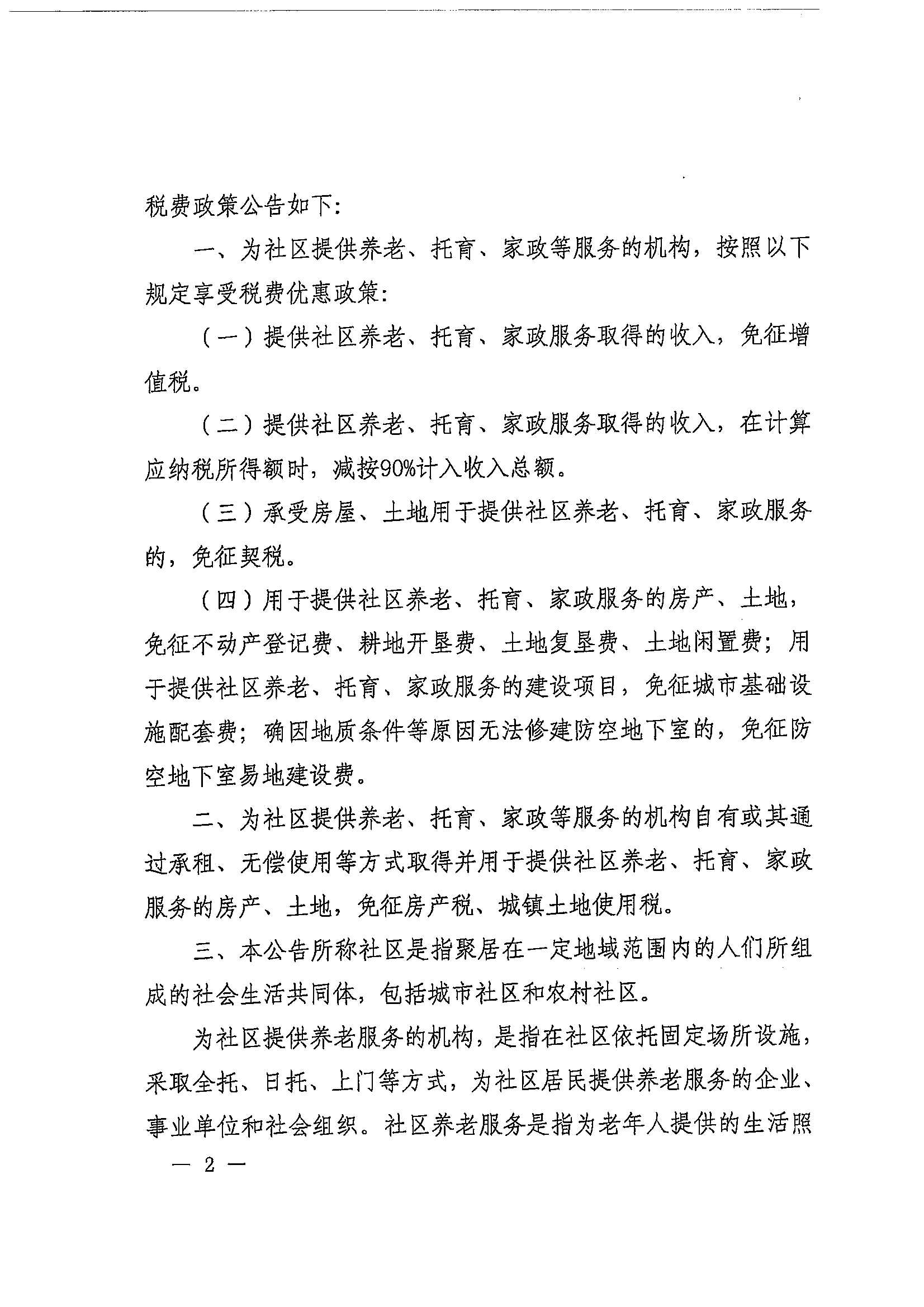 财政部 税务总局 发展改革委 民政部 商务部 卫生健康委关于养老、托育、家政等社区家庭服务业税费优惠政策的公告_政策文件_江门市财政局