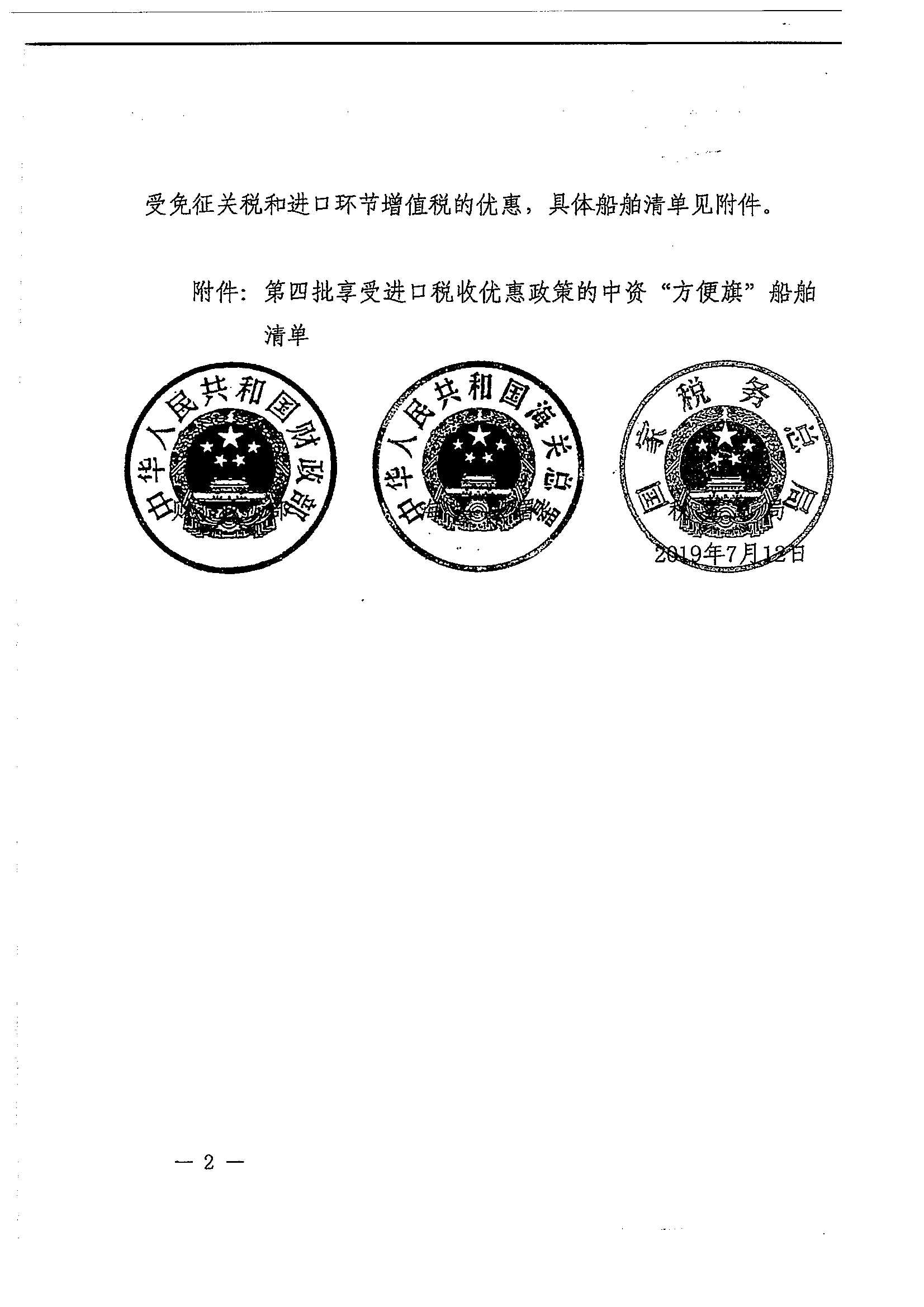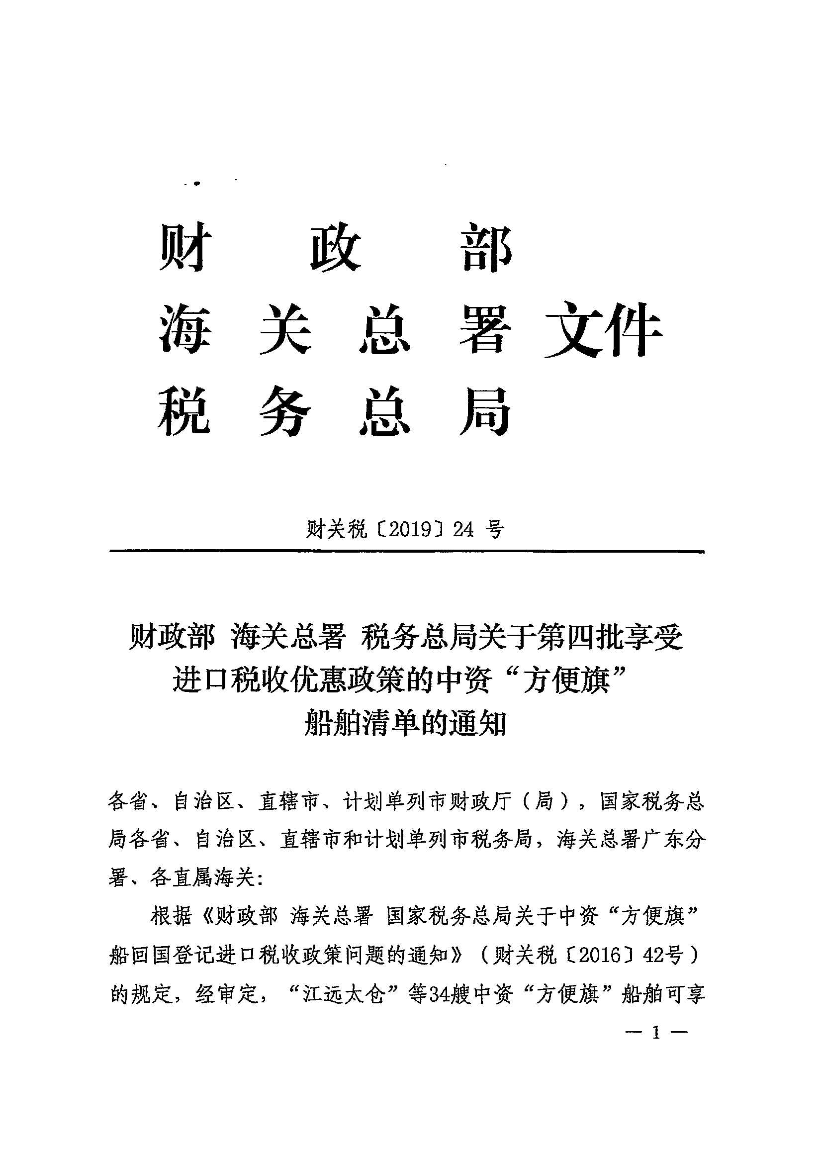 财政部 海关总署 税务总局关于第四批享受进口税收优惠政策的中资“方便旗”船舶清单的通知_政策文件_江门市财政局