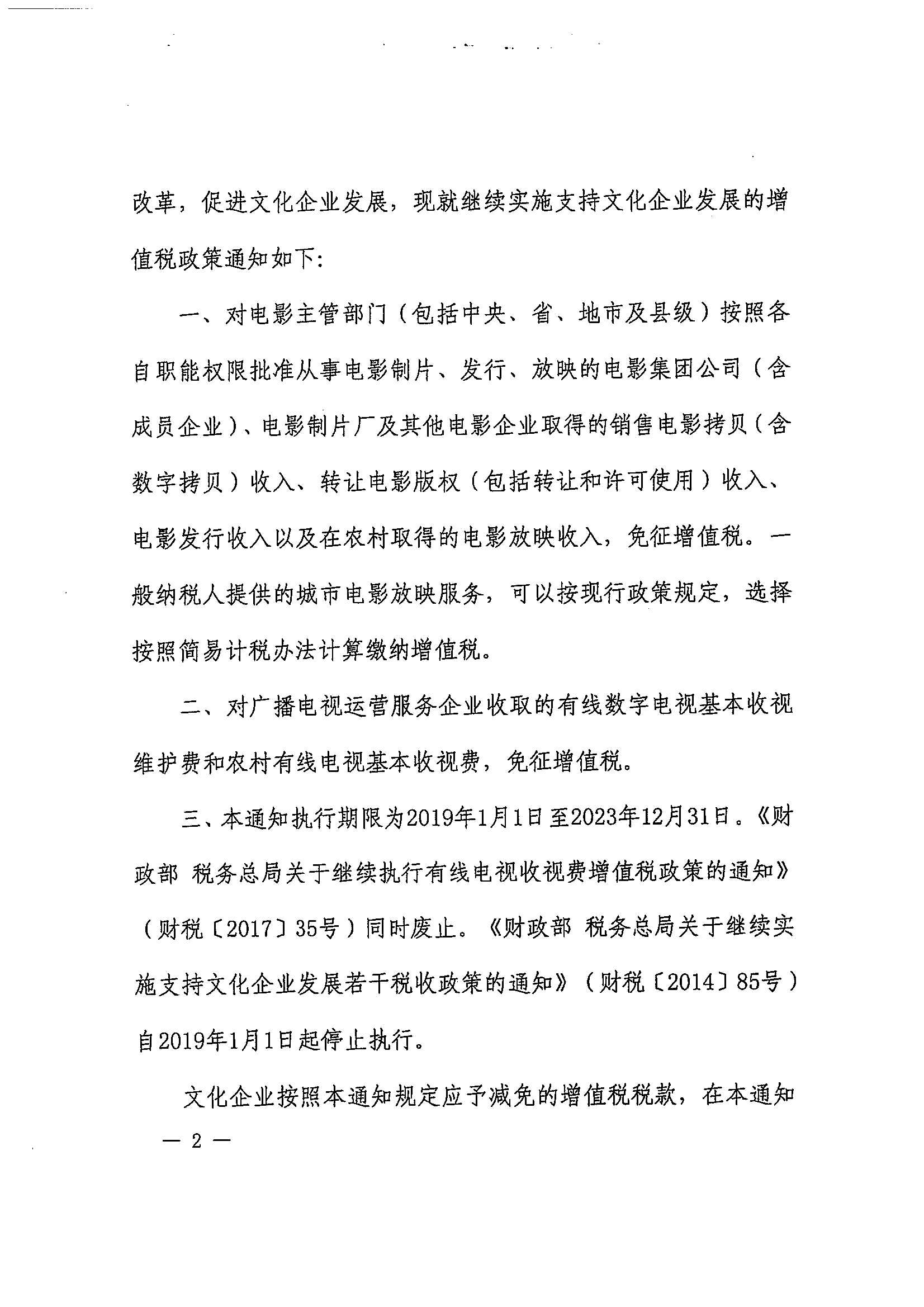 财政部 税务总局关于继续实施支持文化企业发展增值税政策的通知