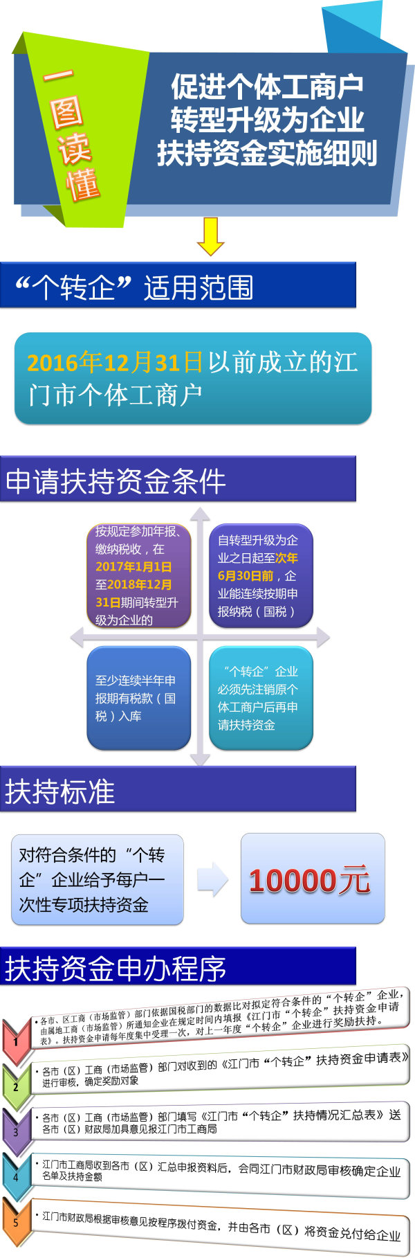 经市人民政府同意,现将《江门市工商行政管理局 江门市财政局关于促进个体工商户转型升级为企业扶持资金实施细则》印发给你们,请遵照执行。执行过程遇到的问题,请及时向江门市工商局反馈。