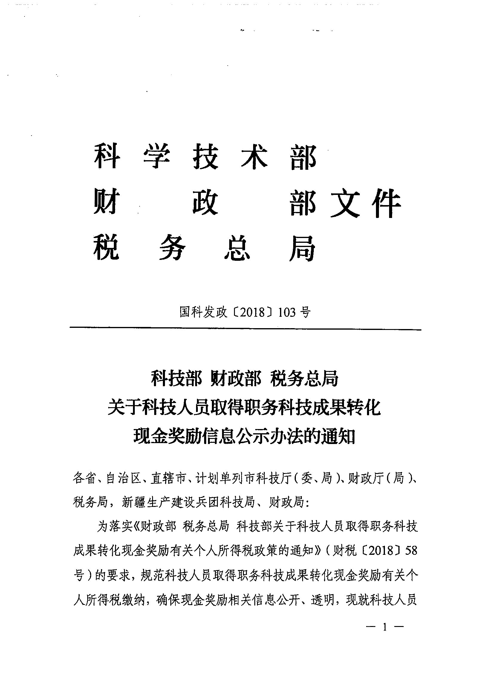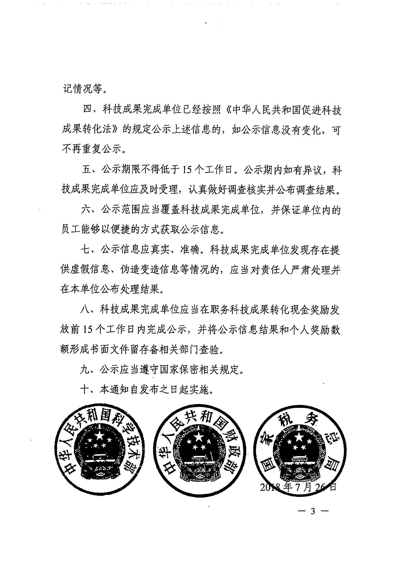 科技部 财政部 税务总局关于科技人员取得职务科技成果转化现金奖励信息公示办法的通知_政策文件_江门市财政局