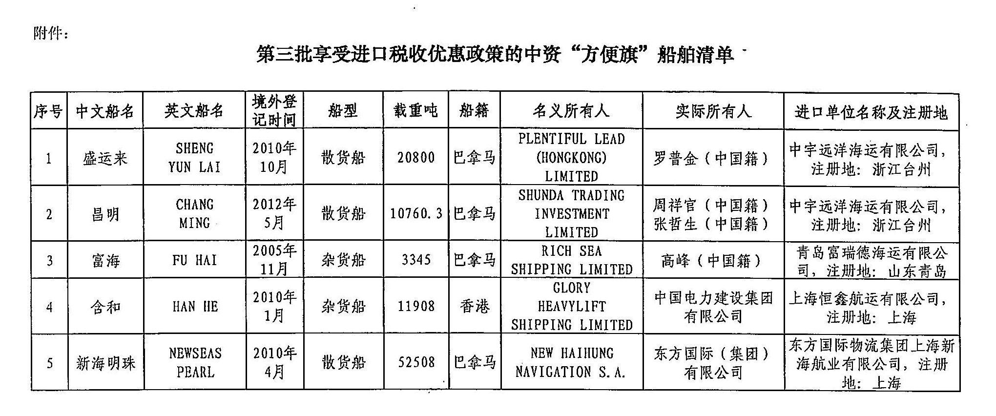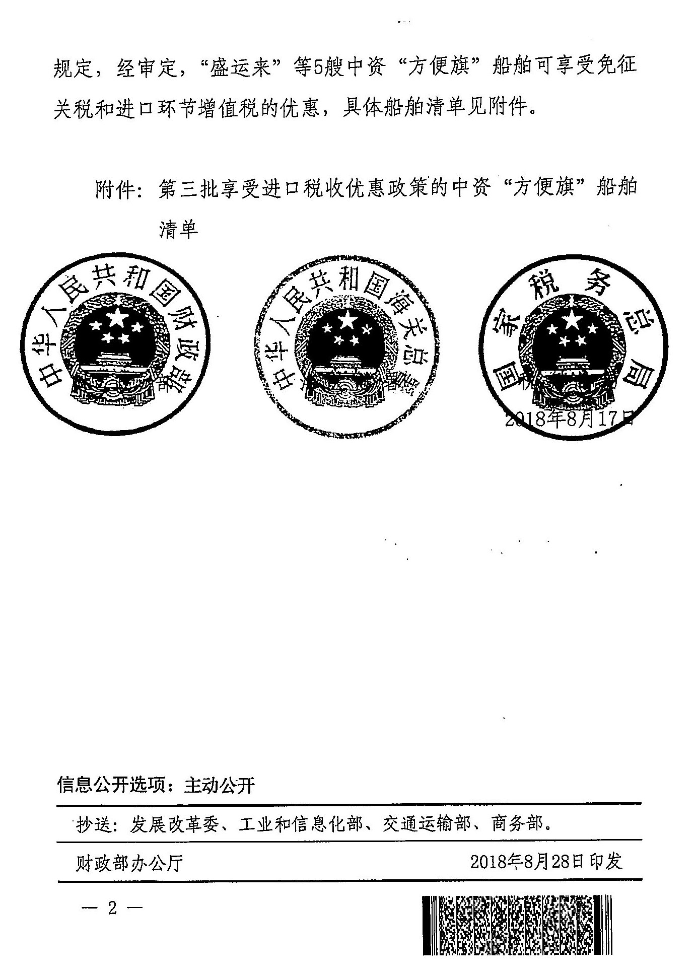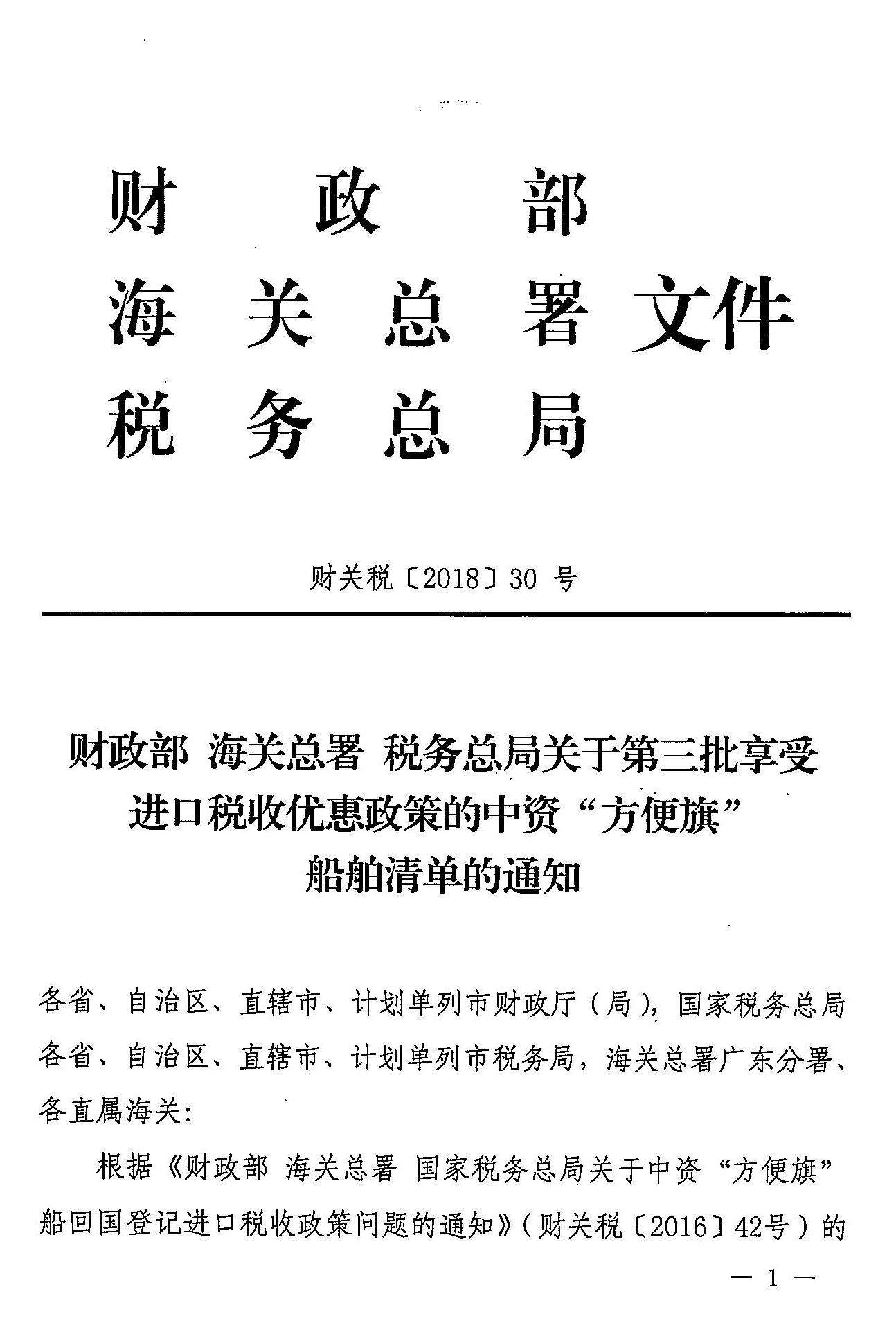 财政部 海关总署 税务总局关于第三批享受进口税收优惠政策的中资“方便旗”船舶清单的通知_政策文件_江门市财政局
