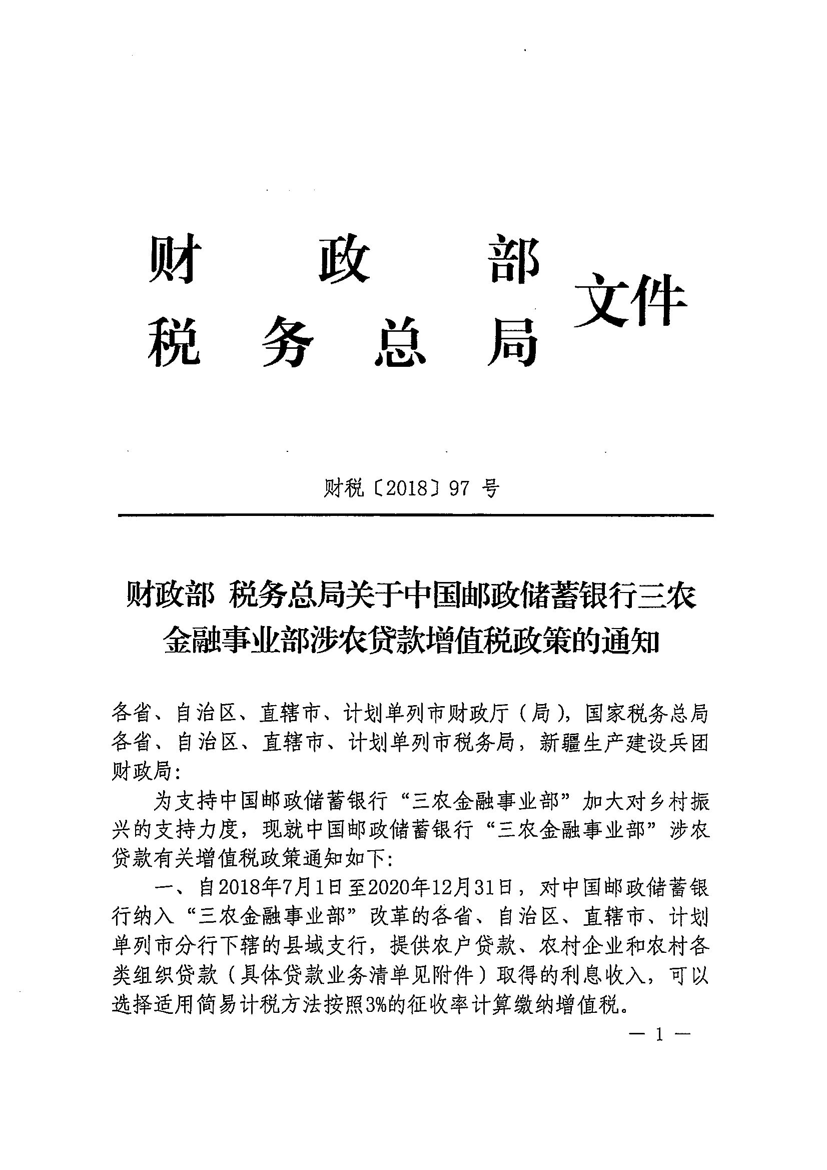财政部 税务总局关于中国邮政储蓄银行三农金融事业部涉农贷款增值税政策的通知_政策文件_江门市财政局