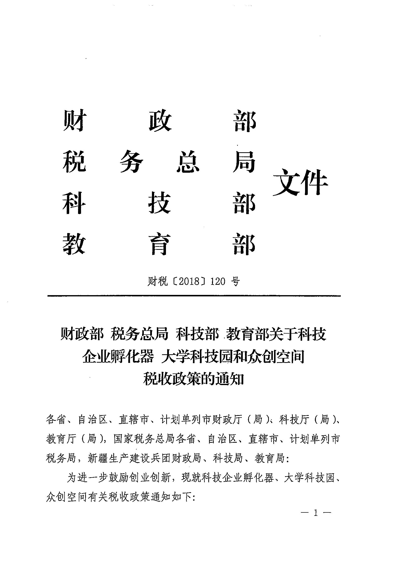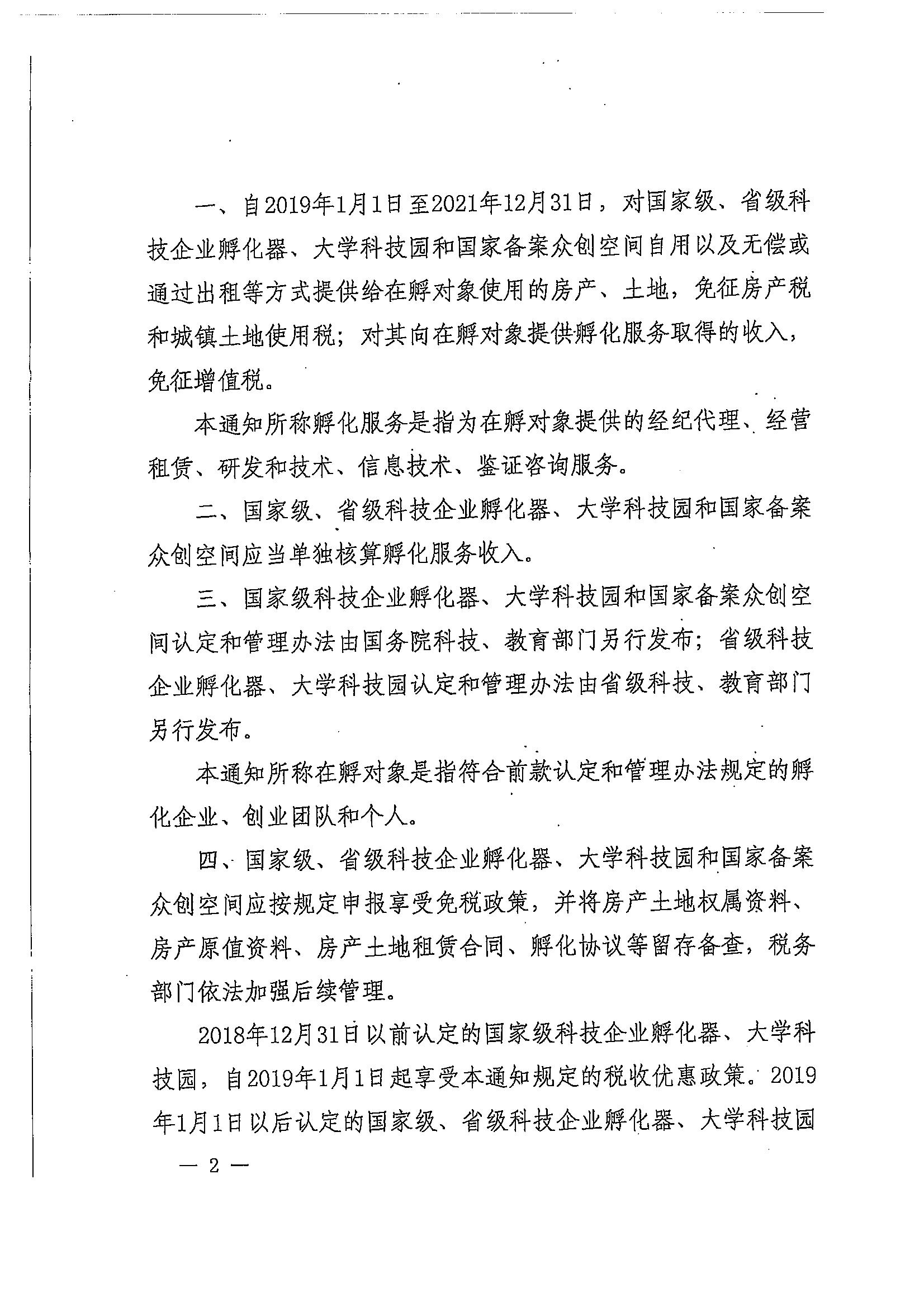 财政部 税务总局 科技部 教育部关于科技企业孵化器 大学科技园和众创空间税收政策的通知_政策文件_江门市财政局