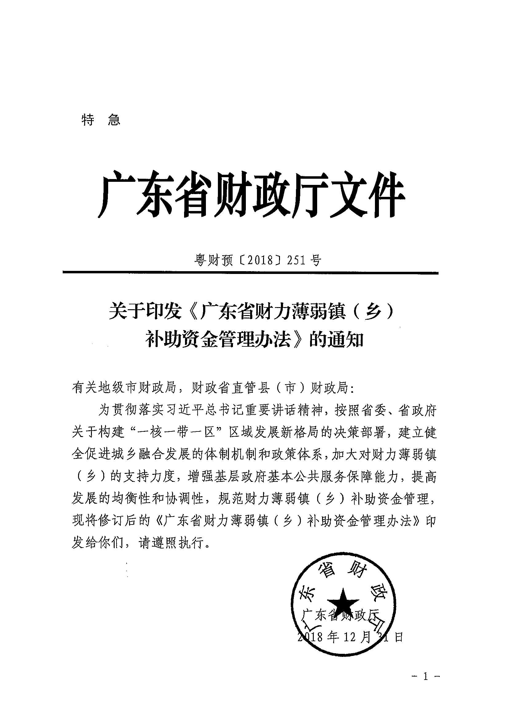 现将广东省财政厅《关于印发<广东省财力薄弱镇(乡)补助资金管理办法>的通知》(粤财预〔2018〕251号)转发给你们,请遵照执行。