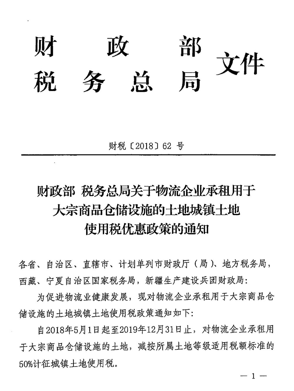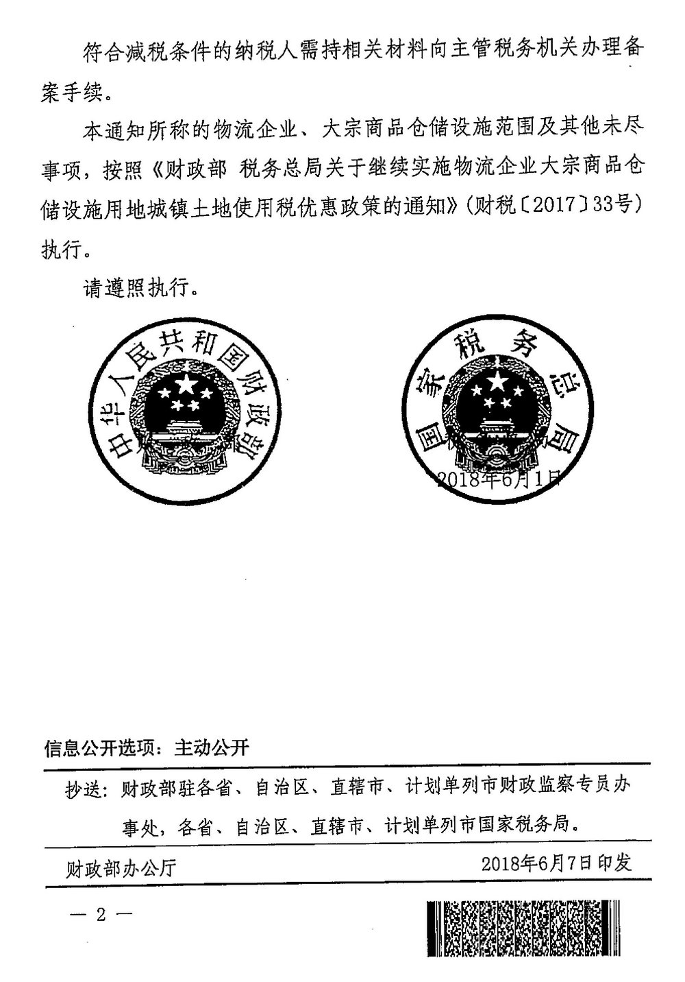 财政部 税务总局关于物流企业承租用于大宗商品仓储设施的土地城镇土地使用税优惠政策的通知_税收政策_江门市财政局