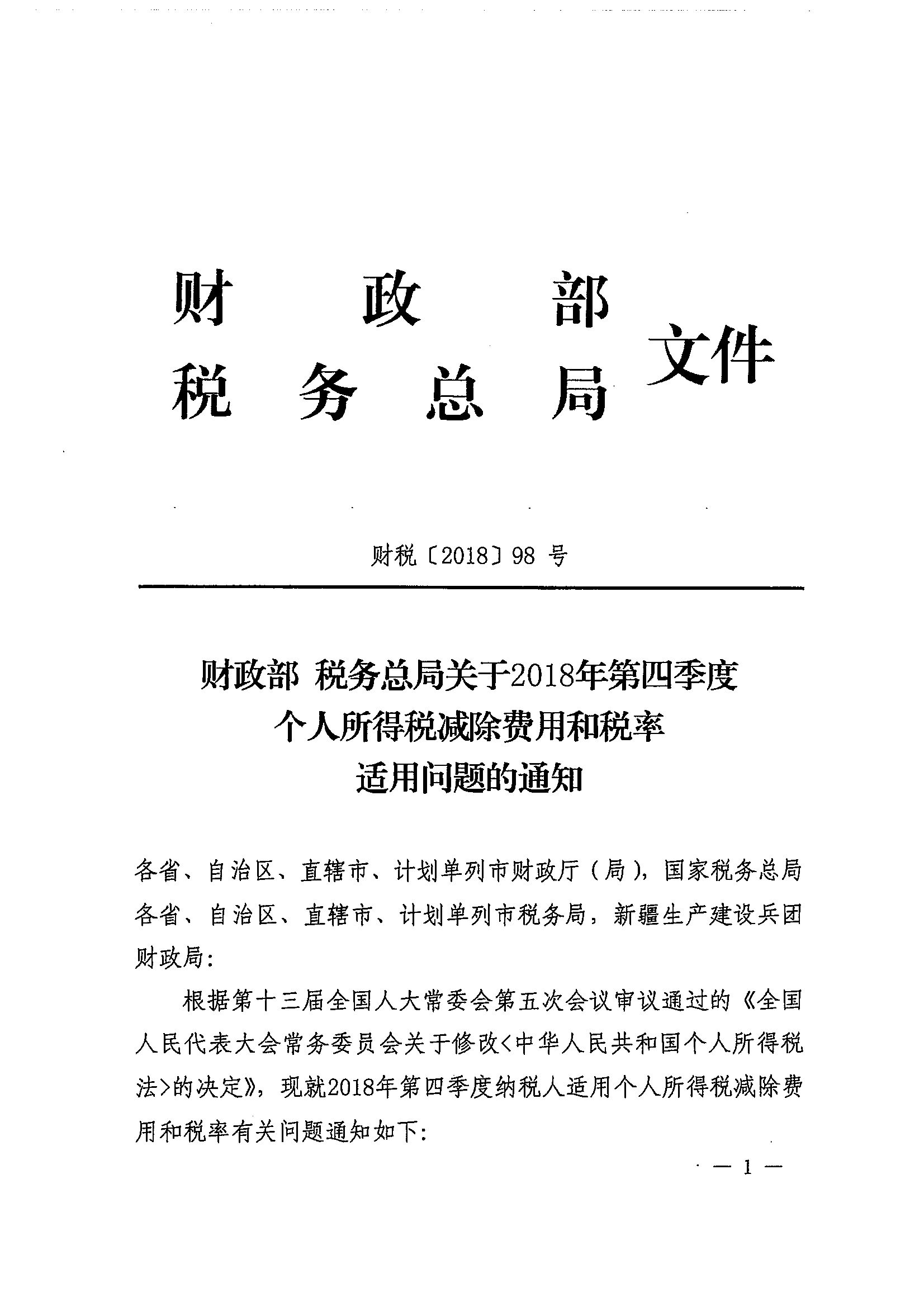 财政部 税务总局关于2018年第四季度个人所得税减除费用和税率适用问题的通知