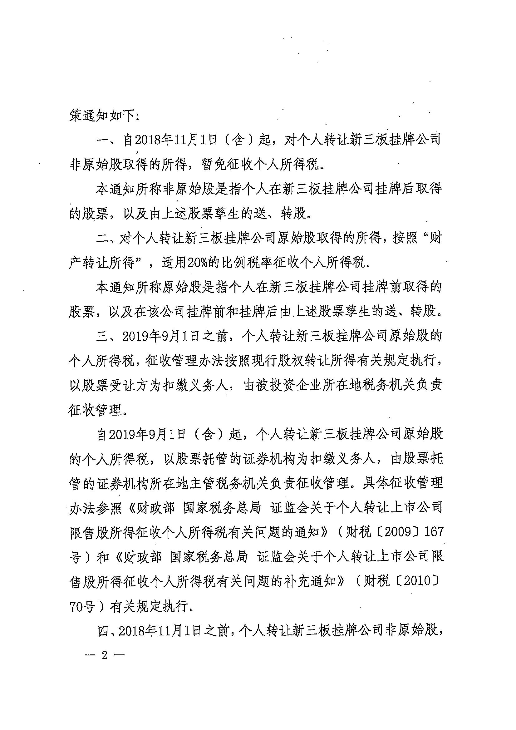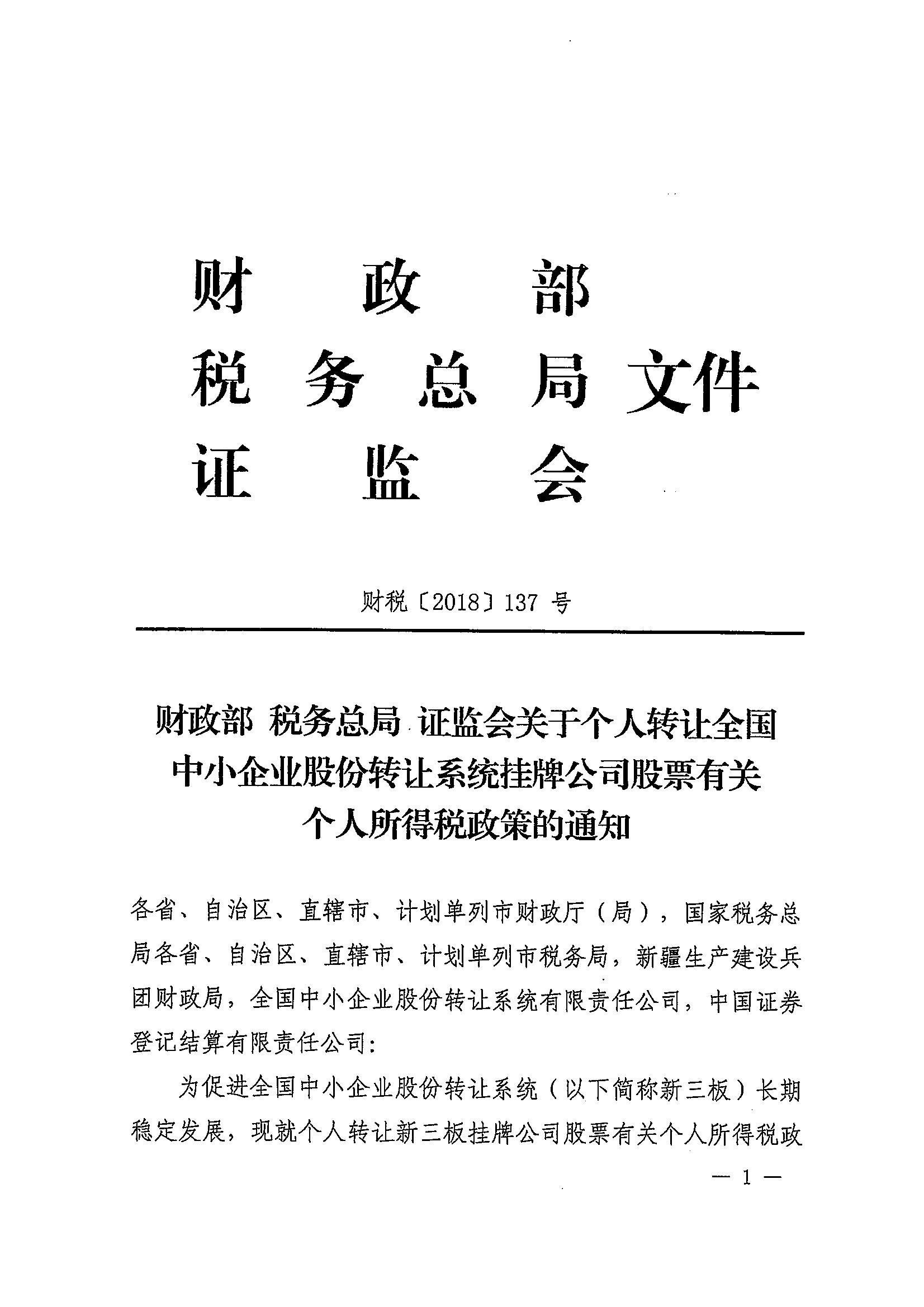 财政部 税务总局 证监会关于个人转让全国中小企业股份转让系统挂牌公司股票有关个人所得税政策的通知_税收政策_江门市财政局