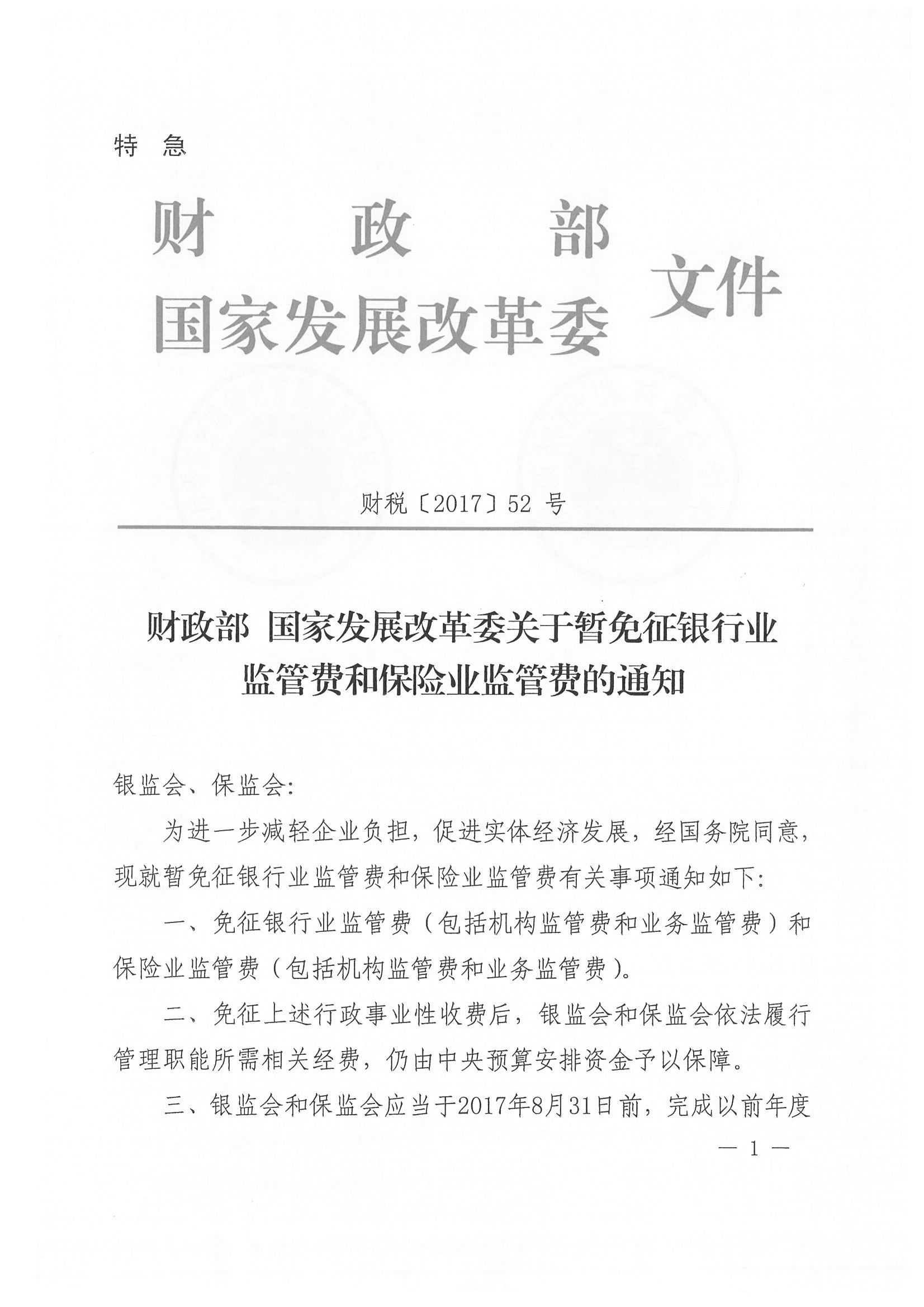 财政部 国家发展改革委关于暂 免征银行业监管费和保险业监管费的通知