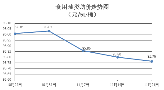 食用油类商品价格稳中微降。本周所监测的9种食用油(5L装)商品价格波动情况为2跌7平,综合零售均价为95.76元/桶,环比下降0.04%。其中:鲁花花生油、金龙鱼调和油零售均价分别为每桶158.38元、69.71元,环比分别下降0.03%、持平。