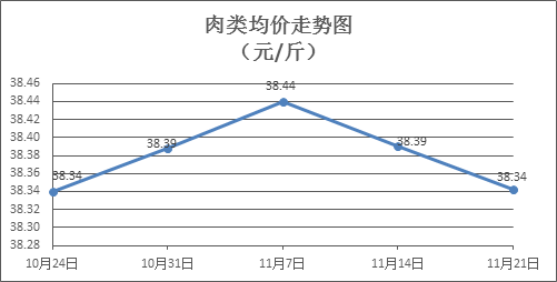 肉类商品价格总体微降。本周所监测的8种肉类商品价格波动情况为3涨3跌2平,综合零售均价为38.34元/斤,环比下降0.12%。其中:排骨、精瘦肉、有皮上肉、牛肉零售均价分别为每斤35.99元、25.71元、20.71元、54.81元,环比分别下降0.88%、下降0.43%、持平、上涨0.16%。