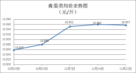 禽蛋类商品价格小幅波动。本周所监测的6种禽蛋类商品价格波动情况为2涨3跌1平,综合零售均价为10.957元/斤,环比下降0.03%。其中:白条鸡、白条鸭零售均价分别为每斤20.32元、15.25元,环比分别下降0.34%、下降1.29%;红壳鸡蛋、鸭蛋零售均价分别为每斤6.84元、7.69元,环比分别下降0.44%、上涨0.65%。