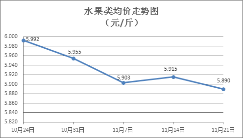 水果类商品价格微幅下降。本周所监测的6种水果商品价格波动情况为5跌1平,综合零售均价为5.890元/斤,环比下降0.42%。其中橙子、葡萄、梨零售均价分别为每斤6.33元、11.49元、4.85元,环比分别下降0.78%、持平、下降0.41%。