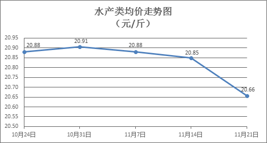水产类商品价格有所下降。本周所监测的10种水产商品价格波动情况为2涨7跌1平,综合均价为20.66元/斤,环比下降0.93%。其中:草鱼、鳙鱼、罗非鱼、基围虾零售均价分别为每斤11.43元、10.87元、8.56元、37.42元,环比分别下降0.95%、上涨0.56%、下降0.81%、下降0.43%。