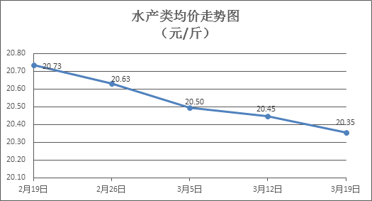 水产类商品价格主降。本周所监测的10种水产商品价格波动情况为4涨5跌1平,综合均价为20.35元/斤,环比下降0.45%。其中:草鱼、鲫鱼、罗非鱼、基围虾零售均价分别为每斤10.85元、13.95元、8.47元、38.27元,环比分别下降1.18%、上涨0.14%、下降1.40%、下降0.75%。
