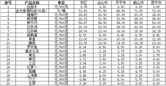 说明:1、表中价格为该地区监测点综合平均价;2、“市区”含蓬江区、江海区、新会区,价格分别采自蓬江市场、江南市场、城东市场等13家农贸市场;3、其他四个县市价格分别采自新华市场、锦江市场等8家农贸市场。