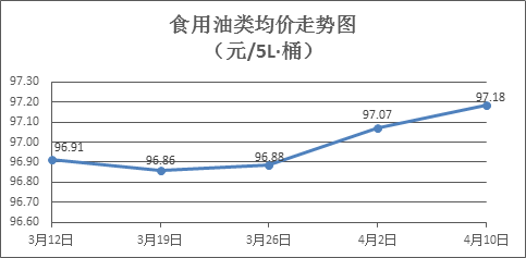 食用油类商品价格总体微升。本周所监测的9种食用油(5L装)商品价格浮动情况为5涨3跌1平,综合零售均价为97.18元/桶,环比上涨0.12%。其中:金龙鱼花生油、金龙鱼调和油零售均价分别为每桶105.44元、71.71元,环比分别上涨0.34%、上涨0.03%。