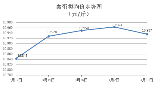 禽蛋类商品价格窄幅盘整。本周所监测的6种禽蛋类商品价格波动情况为2涨3跌1平,综合零售均价为10.937元/斤,环比下降0.24%。其中:白条鸡、白条鸭零售均价分别为每斤19.88元、15.21元,环比分别上涨0.56%、下降1.11%;白壳鸡蛋、鸭蛋零售均价分别为每斤6.94元、7.82元,环比分别下降0.72%、持平。