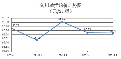食用油类商品价格微幅波动。上周所监测的9种食用油(5L装)商品价格波动情况为3涨2跌4平,综合零售均价为96.75元/桶,环比持平。其中:金龙鱼花生油、金龙鱼调和油零售均价分别为每桶104.65元、70.96元,环比分别上涨0.05%、持平。
