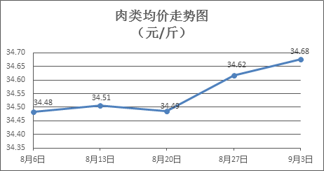 肉类商品价格微幅上涨。上周所监测的8种肉类商品价格波动情况为6涨2跌,综合零售均价为34.68元/斤,环比上涨0.17%。其中:排骨、精瘦肉、有皮上肉、牛肉、带骨羊肉零售均价分别为每斤29.83元、18.76元、14.26元、53.94元、45.25元,环比分别下降0.10%、上涨0.11%、上涨0.07%、上涨0.15%、上涨0.33%。