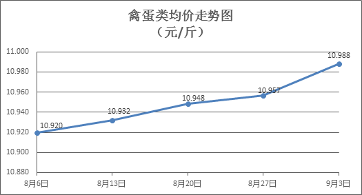 禽蛋类商品价格总体略涨。上周所监测的6种禽蛋类商品价格波动情况为4涨1跌1平,综合零售均价为10.988元/斤,环比上涨0.29%。其中:白条鸡、白条鸭零售均价分别为每斤19.62元、15.68元,环比分别上涨0.62%、上涨0.26%;白壳鸡蛋、鸭蛋零售均价分别为每斤6.77元、7.93元,环比分别上涨0.45%、持平。