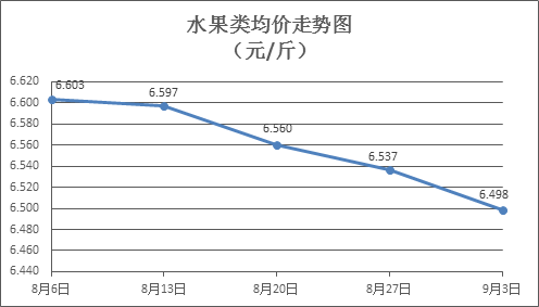 水果类商品价格总体略降。上周所监测的6种水果商品价格波动情况为1涨3跌2平,综合零售均价为6.498元/斤,下降0.59%。其中苹果、香蕉、葡萄零售均价分别为每斤7.31元、3.06元、13.20元,环比分别下降0.95%、持平、下降1.12%。