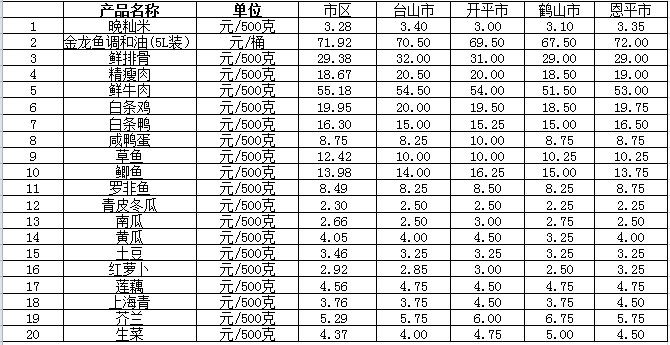 说明:1、表中价格为该地区监测点综合平均价;2、“市区”含蓬江区、江海区、新会区,价格分别采自蓬江市场、江南市场、城东市场等13家农贸市场;3、其他四个县市价格分别采自新华市场、锦江市场等8家农贸市场。
