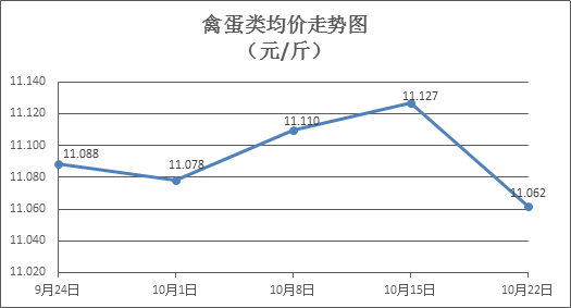 禽蛋类商品价格总体略降。上周所监测的6种禽蛋类商品价格波动情况为2涨4跌,综合零售均价为11.062元/斤,环比下降0.58%。其中:白条鸡、白条鸭零售均价分别为每斤19.72元、15.37元,环比分别下降0.80%、下降1.09%;白壳鸡蛋、鸭蛋零售均价分别为每斤7.11元、8.12元,环比分别上涨0.28%、下降0.12%。