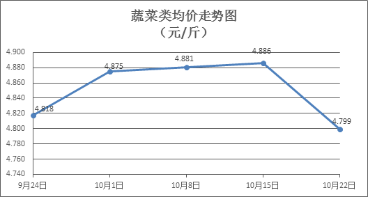 蔬菜类商品价格普遍下降。上周所监测的32 种蔬菜商品价格波动情况为2涨28跌2平,综合零售均价为4.799元/斤,环比下降1.77%。其中:涨幅居前的品种包括莲藕、西洋菜,零售均价分别为每斤4.65元、6.66元,环比分别上涨0.65%、0.15%;跌幅居前的品种为白苋菜、本地菜心、丝瓜,零售均价为每斤4.28元、5.48元、4.84元,环比分别下降8.55%、6.64%、4.54%。