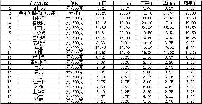 说明:1、表中价格为该地区监测点综合平均价;2、“市区”含蓬江区、江海区、新会区,价格分别采自蓬江市场、江南市场、城东市场等13家农贸市场;3、其他四个县市价格分别采自新华市场、锦江市场等8家农贸市场。