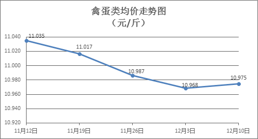 家禽类商品价格小幅回升。上周所监测的6种禽蛋类商品价格波动情况为2涨2跌2平,综合零售均价为10.975元/斤,环比上涨0.06%。其中:白条鸡、白条鸭零售均价分别为每斤19.67元、15.36元,环比分别上涨0.31%、上涨0.13%;白壳鸡蛋、鸭蛋零售均价分别为每斤6.80元、8.06元,环比分别下降0.15%、持平。