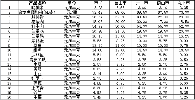 说明:1、表中价格为该地区监测点综合平均价;2、“市区”含蓬江区、江海区、新会区,价格分别采自蓬江市场、江南市场、城东市场等13家农贸市场;3、其他四个县市价格分别采自新华市场、锦江市场等8家农贸市场。
