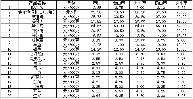 说明:1、表中价格为该地区监测点综合平均价;2、“市区”含蓬江区、江海区、新会区,价格分别采自蓬江市场、江南市场、城东市场等13家农贸市场;3、其他四个县市价格分别采自新华市场、锦江市场等8家农贸市场。