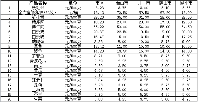 说明:1、表中价格为该地区监测点综合平均价;2、“市区”含蓬江区、江海区、新会区,价格分别采自蓬江市场、江南市场、城东市场等13家农贸市场;3、其他四个县市价格分别采自新华市场、锦江市场等8家农贸市场。