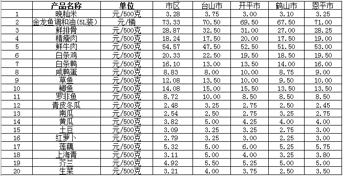 说明:1、表中价格为该地区监测点综合平均价;2、“市区”含蓬江区、江海区、新会区,价格分别采自蓬江市场、江南市场、城东市场等13家农贸市场;3、其他四个县市价格分别采自新华市场、锦江市场等8家农贸市场。