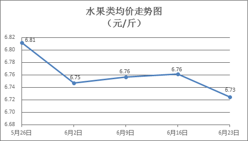 水果类商品价格略有下降。所监测的6种水果商品价格波动情况为2涨4跌,综合零售均价为每斤6.73元,环比下降0.54%。其中橙子、苹果、葡萄零售均价分别为每斤5.66元、7.47元、15.01元,环比分别上涨1.07%、下降0.80%、下降0.33%。