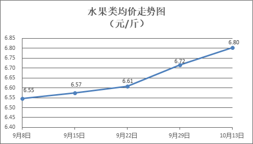 水果类商品价格总体略升。所监测的6种水果商品价格波动情况为4涨2跌,综合零售均价为每斤6.80元,环比上涨1.32%。其中橙子、苹果、葡萄零售均价分别为每斤6.95元、7.52元、13.56元,环比分别上涨2.96%、下降0.13%、上涨1.04%。