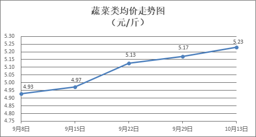 蔬菜类商品价格以涨为主。所监测的32 种蔬菜商品价格波动情况为24涨8跌,综合零售均价为每斤5.23元,环比上涨1.13%。其中:涨幅居前的品种包括青尖椒、西红柿、水空心菜,零售均价分别为每斤6.58元、6.21元、4.39元,环比分别上涨9.85%、9.14%、5.53%;跌幅靠前的品种包括本地菜心、青豆角、南瓜,零售均价分别为每斤5.71元、5.50元、2.84元,环比分别下降11.34%、3.85%、2.74%。