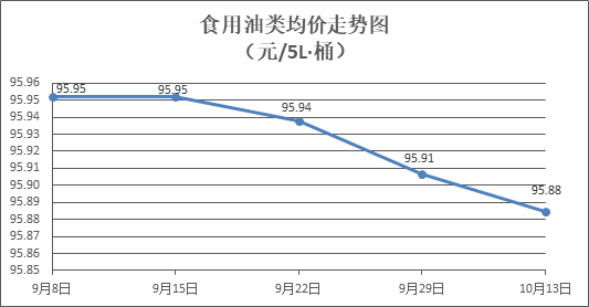 食用油类商品价格总体稳中略降。所监测的9种食用油(5L装)商品价格波动情况为1涨3跌5平,综合零售均价为每桶95.88元,环比下降0.02%。其中:金龙鱼花生油、调和油零售均价分别为每桶102.67元、71.29元,环比分别下降0.04%、下降0.10%。