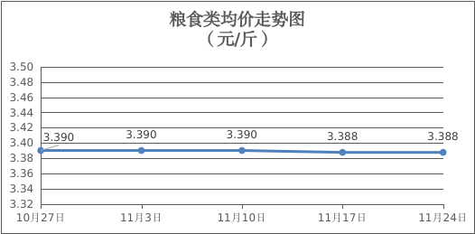 粮食类商品价格保持稳定。所监测的4种粮食类商品价格均持平,零售均价为每斤3.388元。其中:油粘米、富强粉零售均价分别为每斤3.51元、3.36元,环比均持平。